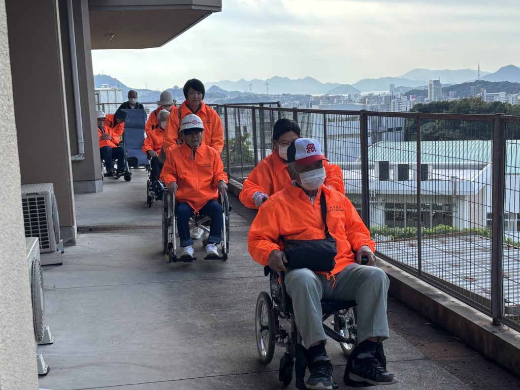 車いすに乗り避難させる様子です。夜間帯は職員の数も少なく、こうして地域の方々の