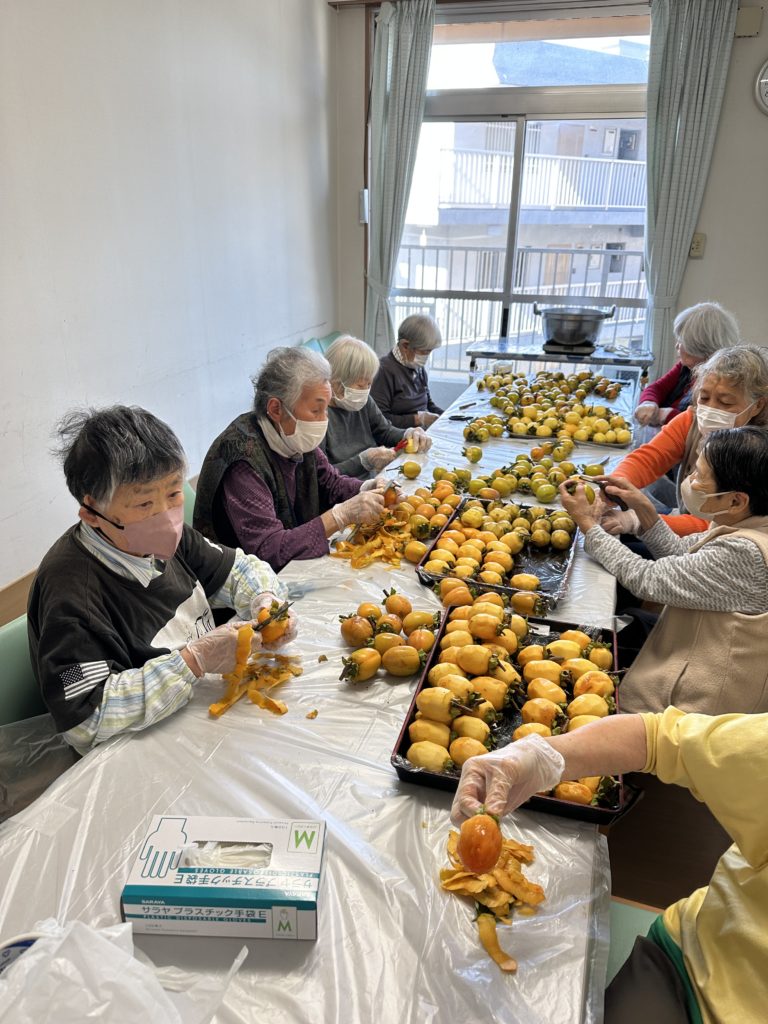 みなさま次から次へと、柿の皮をむいていきます。