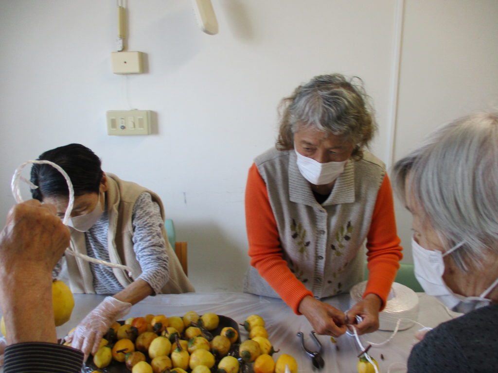 そして柿を吊るすために、紐に一つずつ引っかけていきます。