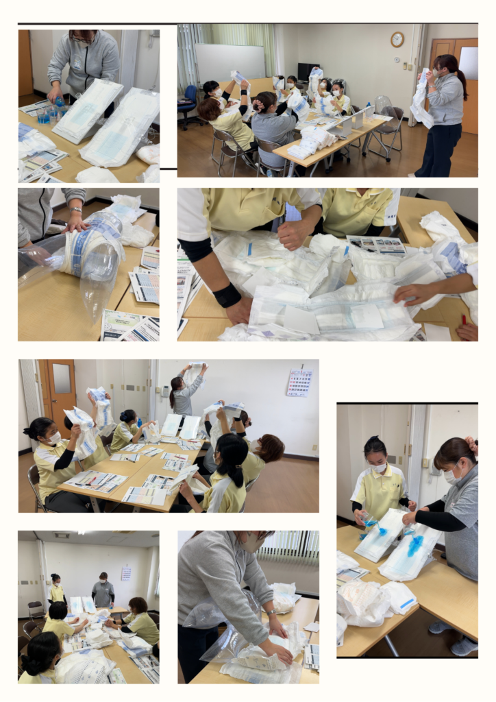そして改めてパットやおむつの正しいあて方などを担当講師から受け、職員みな再認識しました。