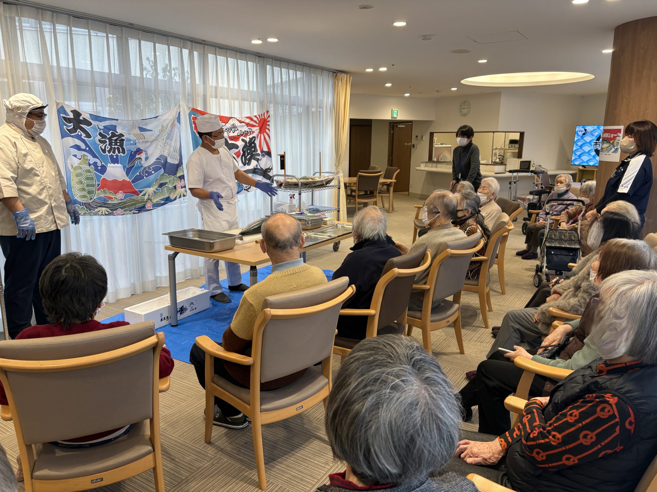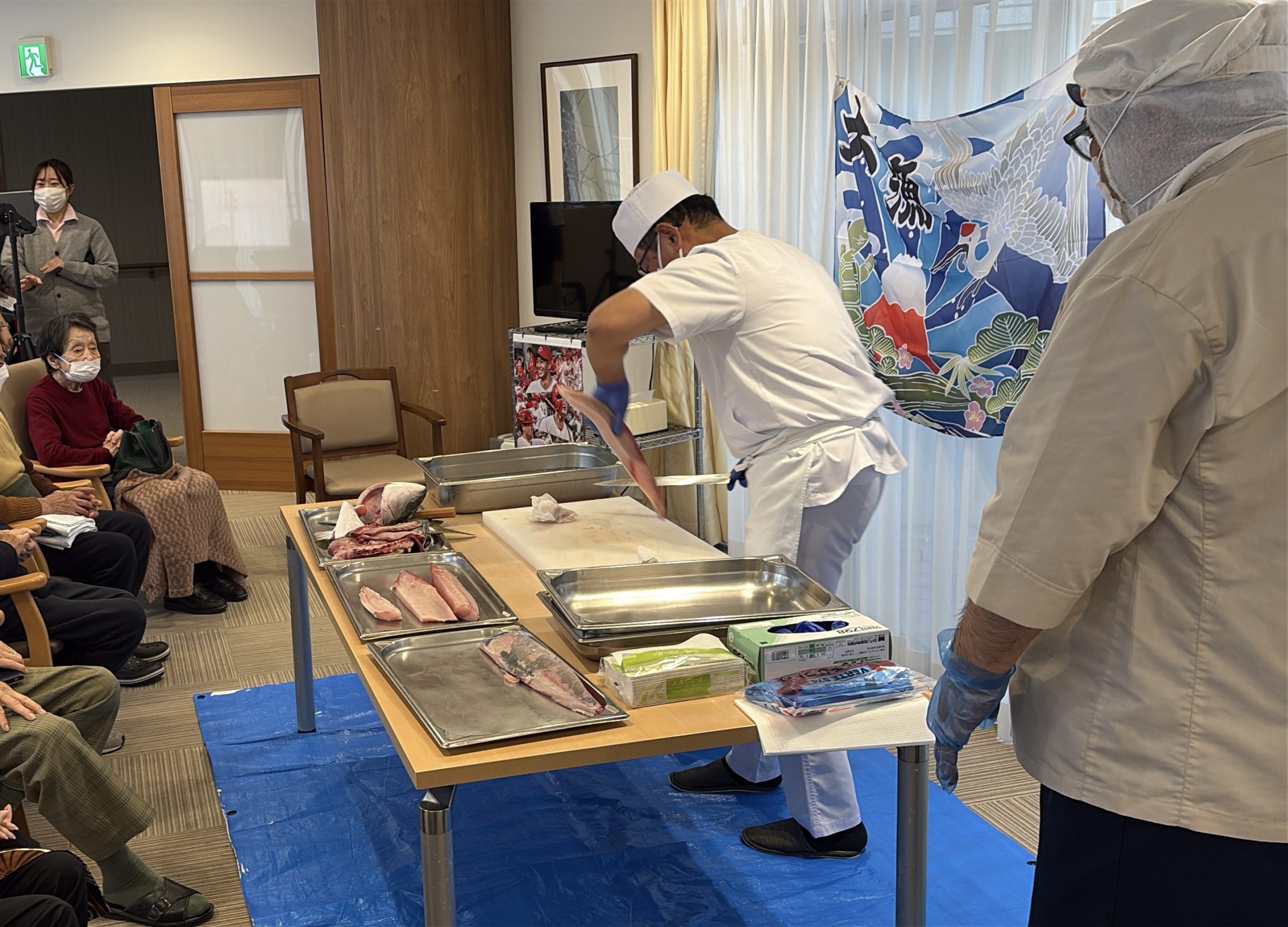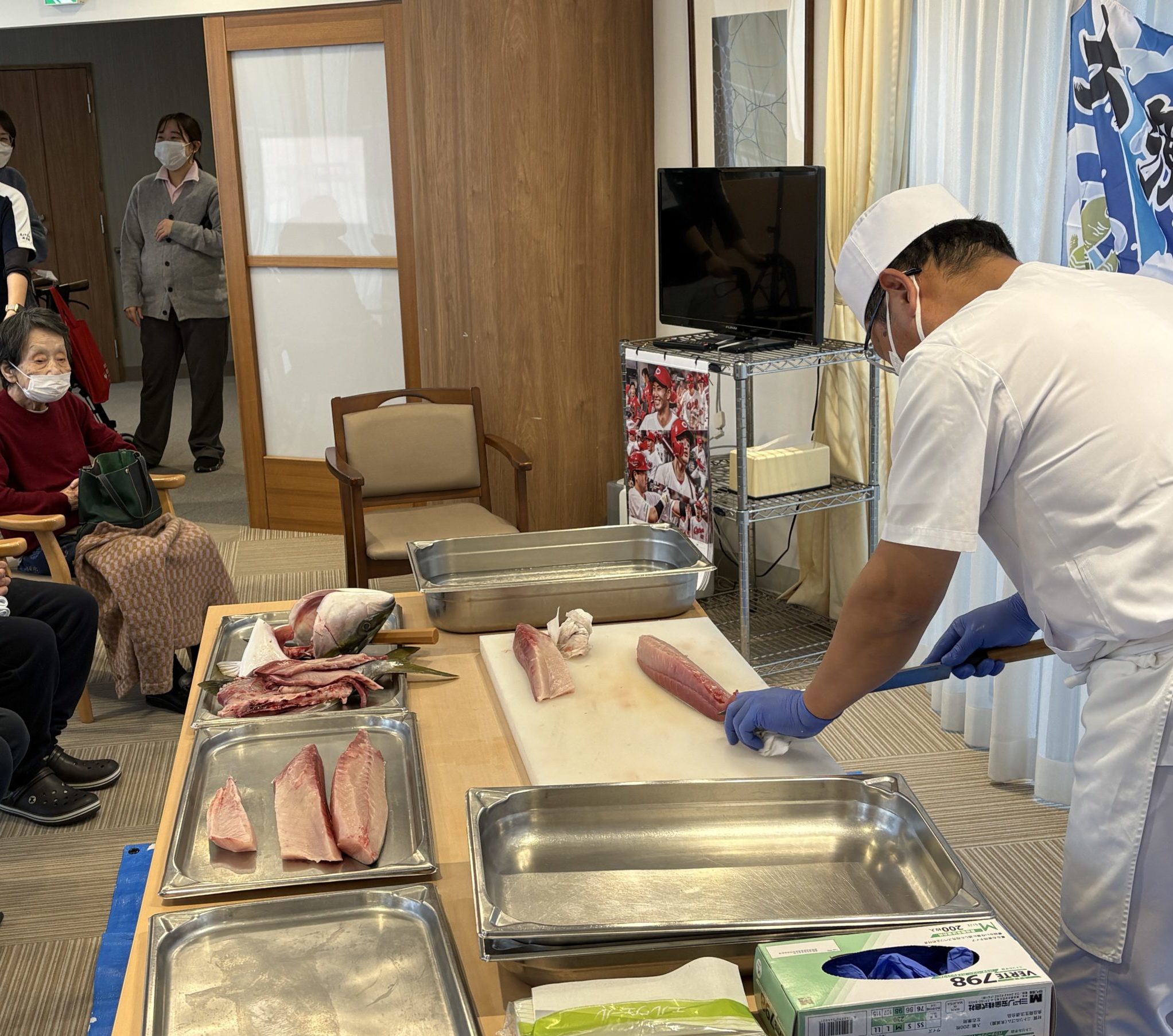 目の前で見る解体ショーを歓声上げながら見られる、入居者様。「美味しそう~」「新鮮」「早く食べたーい」「自分じゃ~こんなに出来ない」等、色々な声が聞こえました👂